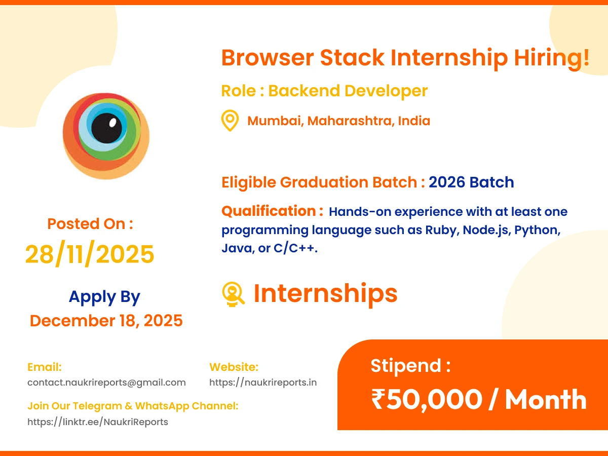 Browser Stack is hiring Backend Developer Interns – 2026 graduates in Mumbai | Stipend ₹50K | Apply by December 18, 2025